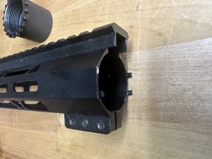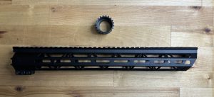 Need a cheap project handguard? This used handguard looks decent, but has some broken tabs holding it into position at the barrel nut. It still locks up tight using the screws, but if you had a forward tango grip and got rough with it you could break off the remaining and get some rotation. Comes with barrel nut, and inside diameter is 1.3″